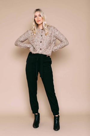 The prettiest vintage inspired cardigan! Slightly shrunken but not cropped, so it's really versatile - wear it over jeans, or over a dress, or give it some edge with our Kristy Faux leather pull on joggers! The little pom details, faux horn buttons and flecked yarn make this sweater really special. Slim but not tight, great for layering tees under and jackets over.