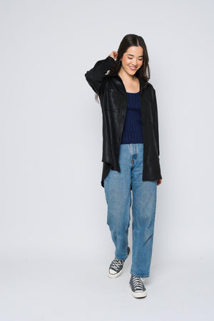 This button-up shirt is as cozy as a sweatshirt, because it’s in our faux leather fleece! It’s actually the softest fleece fabric with a faux leather finish. Wear it closed, as a shirt, or open it up as a layering piece. Super versatile and super comfortable