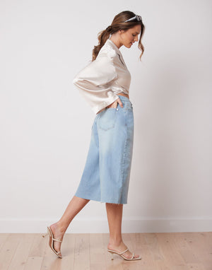 POWER is light-wash blue denim with a 23" inseam designed to sit below the knee for a true 'culotte' look. These jeans have faded details, a high-rise, and raw hems.