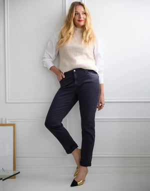 Malia, our relaxed silhouette, is inspired by girlfriend jeans with a tapered leg and perfectly laid-back fit. Featured in Blue Graphite, these classic-rise jeans offer a casually sophisticated look with their deep blue color, 27" inseam and cuffed hem. (29" uncuffed)