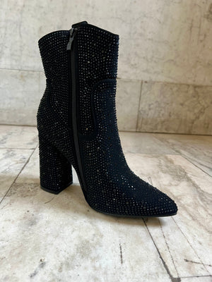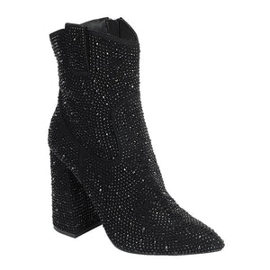Elevate your style with our all-black rhinestone cowboy bootie, featuring a sleek design adorned with dazzling rhinestones. The square heel adds a touch of modern flair, ensuring you stand out with every step. Perfect for those who appreciate bold fashion statements with a hint of Western charm.