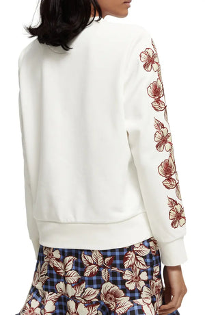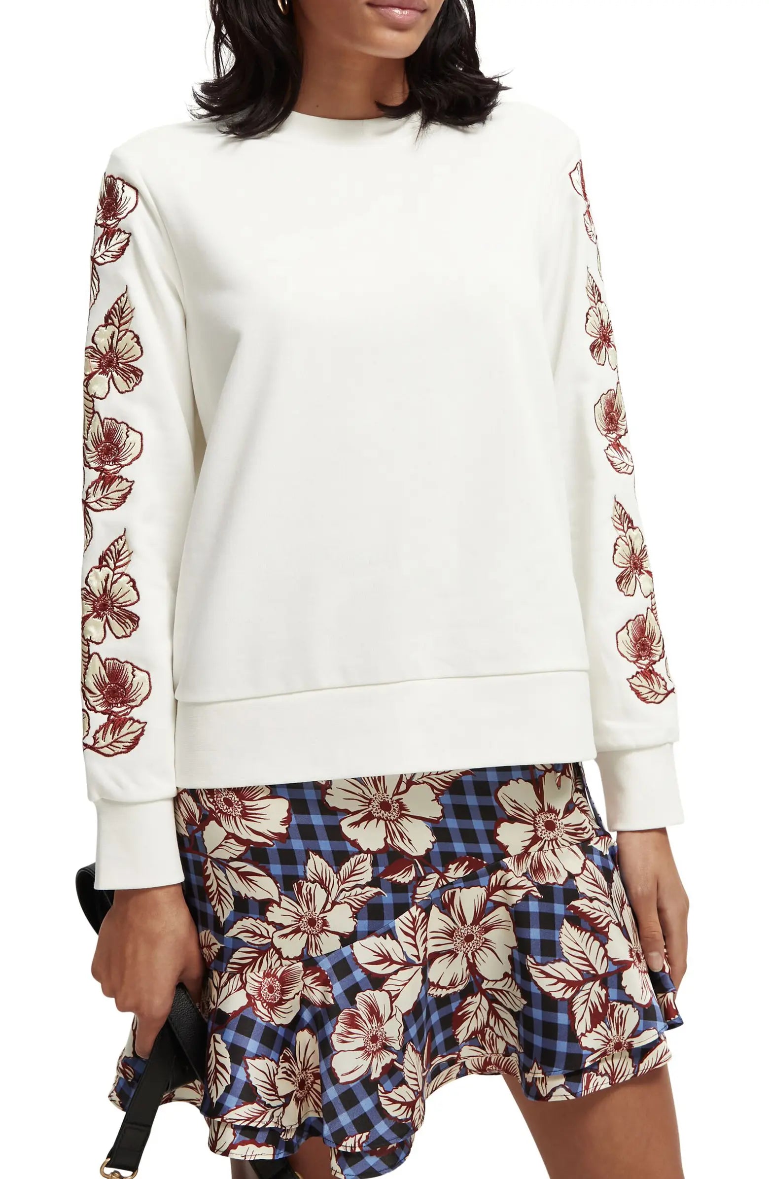 Embroidered flowers trace the sleeves of this cotton sweatshirt for an elevated casual look that goes anywhere.