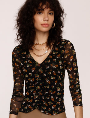 The Nedel Top is a slim-fitting mesh top with ruched sides to skim the curves. It's perfect as a stand alone top, or to layer with your favorite fall jacket.