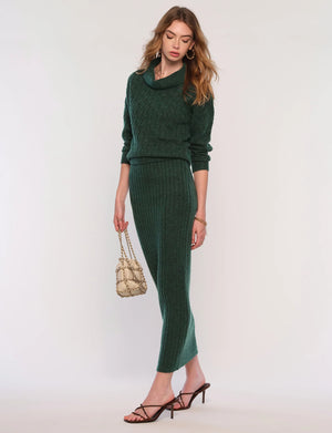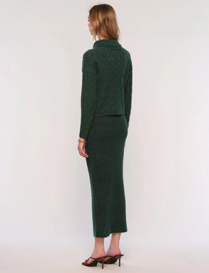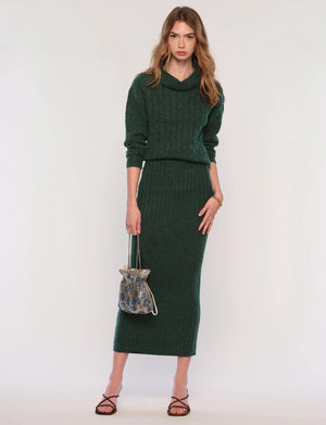 The Oliviera Set is a no brainer. It is knit with a uniform cable stitch from a super soft, cozy yarn. The skirt features a tighter stitch while the top remains relaxed. Both items can be worn seperately to form different outfits.