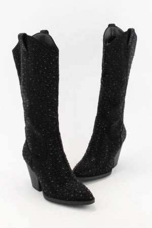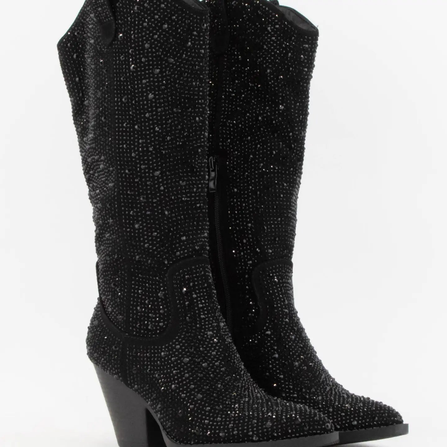 POINTED-TOE RHINESTONE MID-CALF BOOTS CHUNKY HIGH HEELED PULL-UP STYLE IDEAL TO PAIR WITH AN EVENING DRESS OR HOLIDAY LOOK