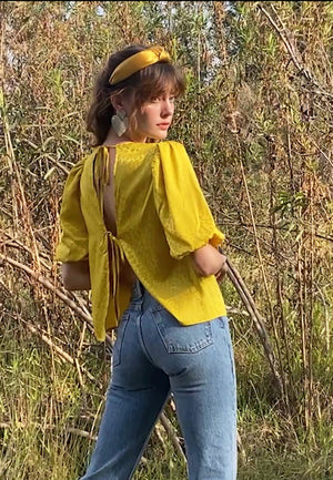 Look good coming and going in the Rocinda Jacquard Open Back Puff Sleeve Blouse. This sophisticated yet sexy top features big puff sleeves with elasticated cuffs, shirring along yoke seam, and an open back with two self-tie details.