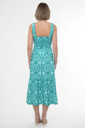 This embroidered midi dress is featured in a blue and green color way. The sleeveless structure is detailed with a ruffled skirt and square neckline