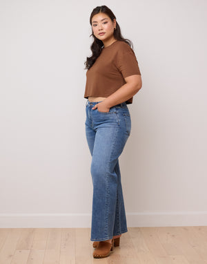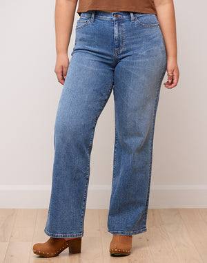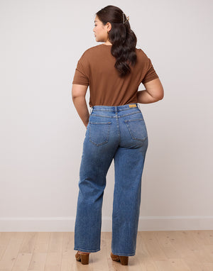 These wide-leg jeans are a faded mid-blue wash that is casual yet stylish, with additional light fading at the thighs and gently worn-in whiskers, giving them the look of well-loved faves. They have a 32" inseam, making them ideal for taller women who prefer a little extra length.