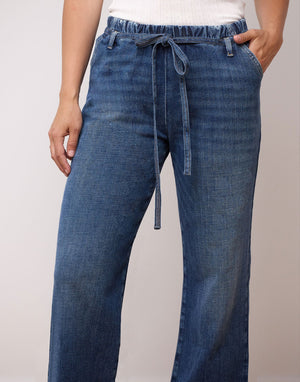 These mid-blue jeans were inspired by the iconic Lionel Richie song "easy like Sunday Morning" since they are the perfect jeans you'd want to slip on for an easy throw-on pair of denim that is comfy to be worn when lounging around or running around for those last-minute Sunday errands. The elastic waist is non-restrictive to provide all-day comfort, and the denim drawstring adds a touch of sophistication.