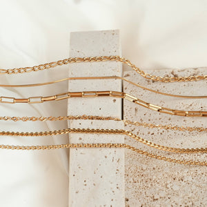 Dainty stainless steel chains finished with 18k gold PVD plating.