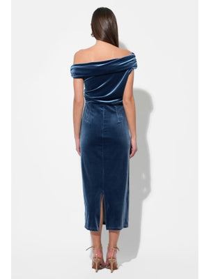 The dress features a flattering off-the-shoulder neckline with a unique, draped and ruched bodice that creates a beautiful, textural detail. The body of the dress has a slim, figure-skimming fit that falls to a midi length.