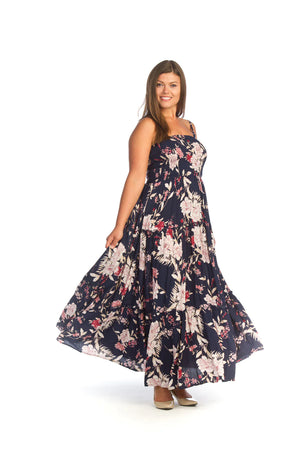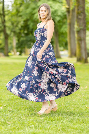 Sleeveless flowing floral dress with smocked bodice and pockets.