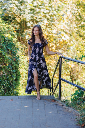 Floral print smocked bodice dress with pockets. Can be worn off or on the shoulder.