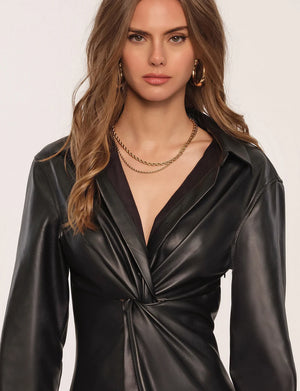 The Siwa Dress is made of our soft vegan leather and has a twist front detail. It's fitted at the waist to highlight your figure. Pair with your favorite ankle boots for fall.