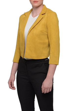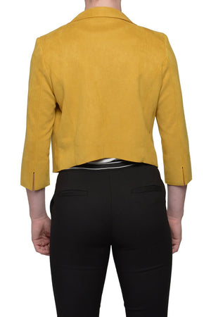 KIA is a cropped eco-suede blazer. Great for travel and transitions easily from work to play. Constructed with luxe and super soft eco-suede fabric that does not pill or wrinkle. KIA fits great and looks great.