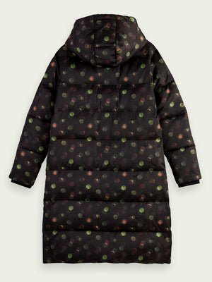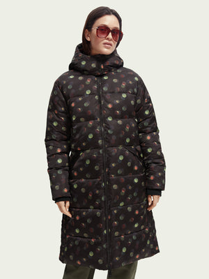 Scotch and Soda Printed longer length puffer coat with detachable hood.
