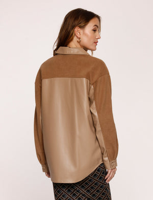 Cold weather chic. The Tonya Jacket is new take on the shacket, made of fleece and our luxe vegan leather. It has chest pockets, a collar for polish, and self-covered snap closure. It has an oversized cozy fit and is perfect for adding flair to any outfit.
