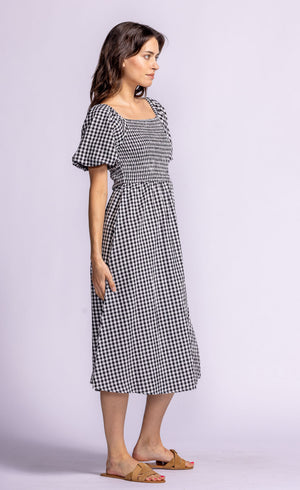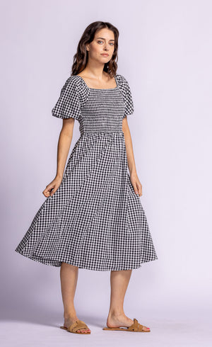 Gingham fit midi and flare dress with smocked bodice and short sleeves