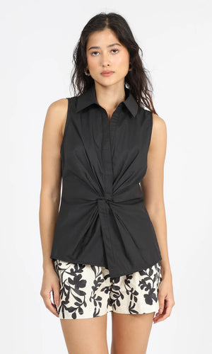 Made with a structured collar and a sleek sleeveless silhouette, this top features a twist-front detail that cinches the waist for a flattering, modern shape. The crisp cotton-blend fabric keeps it polished yet breathable, making it perfect for work-to-weekend styling.