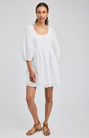 The Coralina dress is made of a cotton fabric with an embroidered eyelet design. Features include a back tie detail and body lining for ease of wear.