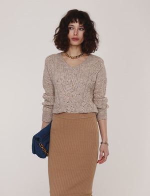 The Acadia Sweater is an easy wear-everyday piece. Knitted in a chunky pointelle stitch in a relaxed fit, this sweater is pefect for showing a bit of decolletage. Pair with satin joggers or our Eve Skirt for a complete look.