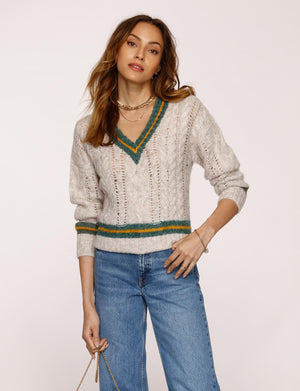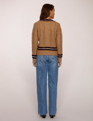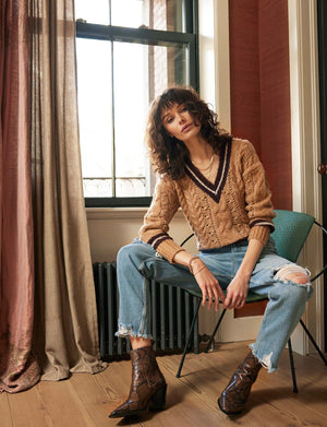 The Mandy Sweater is retro-inspired knitted in our chunky cable stitch in our ultra-soft yarn with contrast striped details. Dress it up with jeans and ankles or go casual with joggers and sneakers.