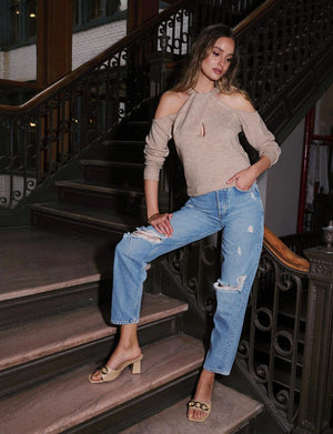 The Tilly Sweater is a must-have for your closet. Made of our soft melange knit, this sweater has a relaxed vibe with its twist front halterneck and cut-out details along the shoulder and bodice. Pair it with jeans and boots for the perfect look.