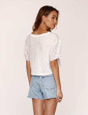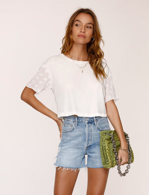 The Eula Tee is an upgrade to a classic t-shirt silhouette. This cropped tee is ultra soft and features oversized sleeves in polkadot-print chiffon. Pair with your favorite jeans or cut-offs and sandals.