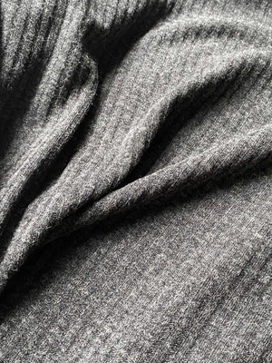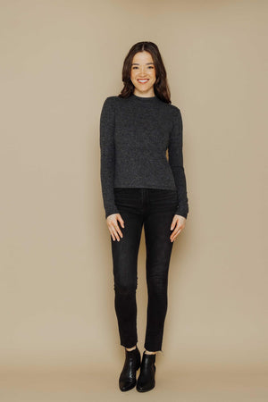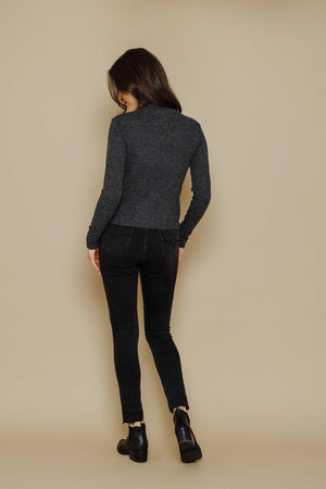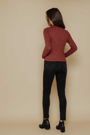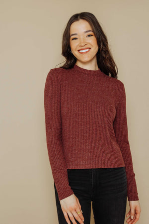 A pretty wide rib, stretch, mock neck long sleeve tee. Super versatile layering piece, body skimming but not too tight