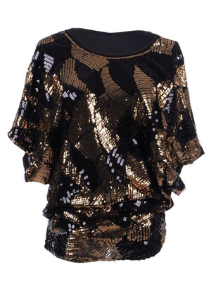 * SHORT DOLMAN SLEEVE TOP. A sparkly top with roomy batwing style sleeves. Crew neck style adds extra coverage for a modest look. A flattering relaxed and loose fit to camoflauge your midsection.