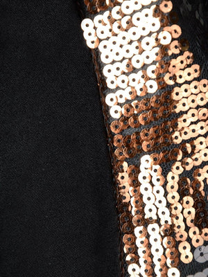 * SEQUIN EMBELLISHED FRONT. Metallic glittering sequins on the front in an art deco inspired pattern. Soft polyester fabric back for comfortable wear.