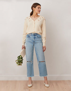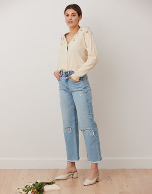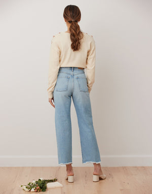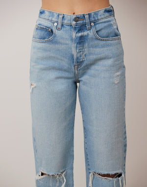 The Chloe straight fits slim through the hip and thigh and has a straight silhouette from the knee down. This high-rise straight jean features a 27" inseam and  a cropped length at ankle. This light blue wash with subtle whiskers gives off true vintage vibes with its distressed details and raw hem.
