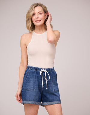 Our Poolside Shorts — the epitome of casual chic for warm, sunny days. Crafted from a light and breathable linen-like denim fabric, these super soft shorts with fading at the hips and thighs offer both comfort and style in one delightful package. The drawstring provides a customizable fit at the waist, allowing you to achieve the perfect level of comfort.