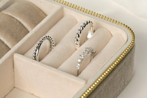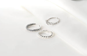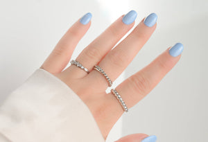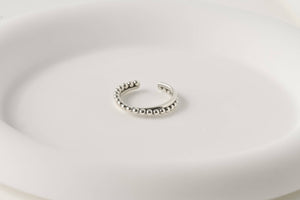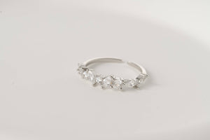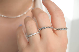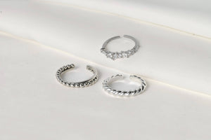 Elevate your style with our sterling silver open rings, available in three designs: beaded and plain interlocked, dazzling diamond cluster, and delicate croissant. The croissant design is also available in gold. Material: 925 Sterling Silver Finish: Silver Croissant is available in gold and silver. Size: Adjustable Band Width: Mixed: 1.5mm x 3.4mm Diamond: 1.5 mm Croissant: 3mm