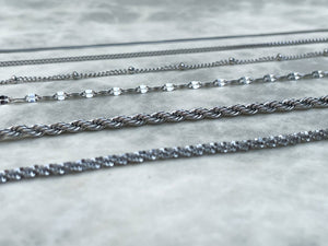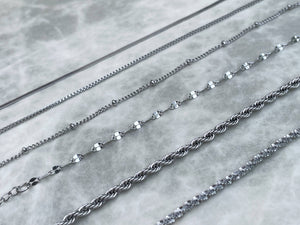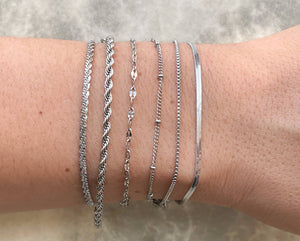 Minimalist and dainty stainless steel bracelets that can be layered / stacked are ideal for mixing and matching! Combine your favorite silver link chains to create a seamless look. Plus, they are tarnish resistant and waterproof; you can wear them to the pool or gym and they won't tarnish. Available in gold too!