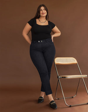 The Emily. Our slim silhouette inspired by 'mom jeans' has a slim fit around the hips and tapered cut throughout the leg.