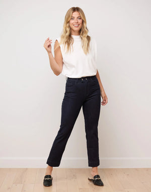 These jeans are a dark indigo wash and feature a double-button and wide waistband, adding a sophisticated, modern touch. They're a classic rise with a 28" inseam.