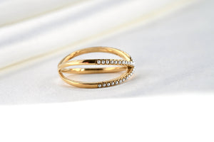 Made in 18k Gold PVD plated stainless steel and set with mini imitation pearls in a pave setting, this waterproof X ring features a gentle overlap of the X and is a piece you will hold on to forever. Pair it with dainty rings to create a stack. Material: Stainless Steel Band Width: 6 mm Size: 6, 7, 8 Colour: Gold